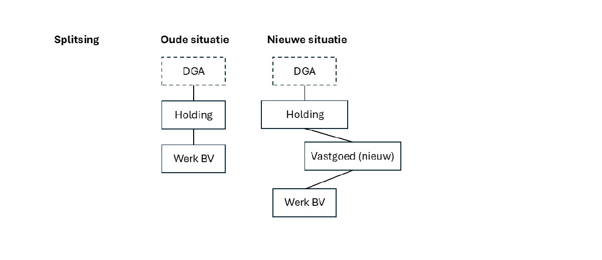 2. Splitsing. Zit er wel een lijfrente in de holding dan is een aandelenfusie niet wenselijk omdat de lijfrente dan in de vastgoed BV zit (holding oud). Een splitsing naar beneden is dan een oplossing. De holding wordt gesplitst in holding en vastgoed nieuw. In vastgoed nieuw komt het vastgoed en de deelneming in werk BV.